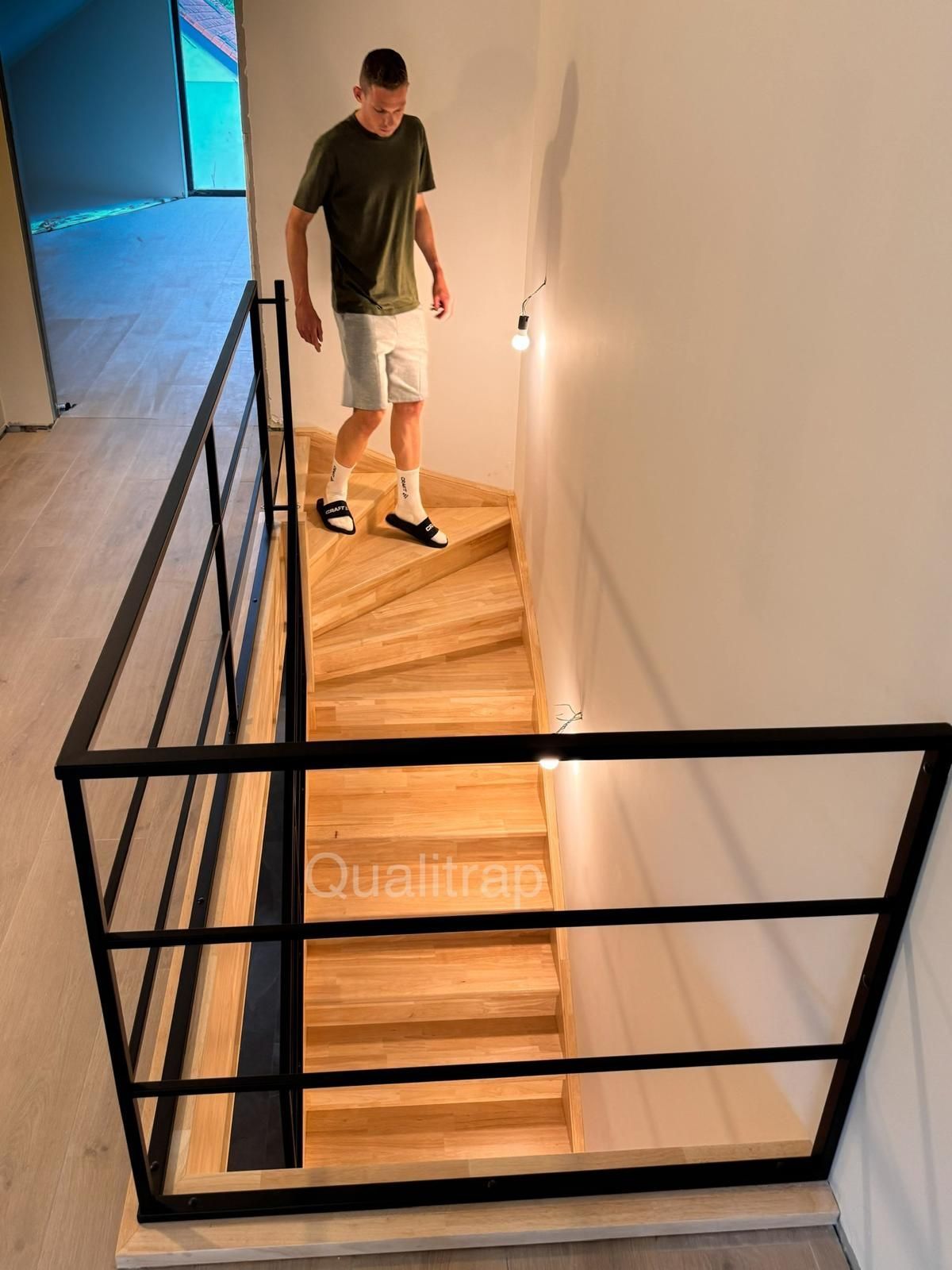 Voor dit project mochten we een op maat gemaakte dubbele kwartdraai trap ontwerpen en plaatsen, volledig afgestemd op de stijl en wensen van de bewoners.
