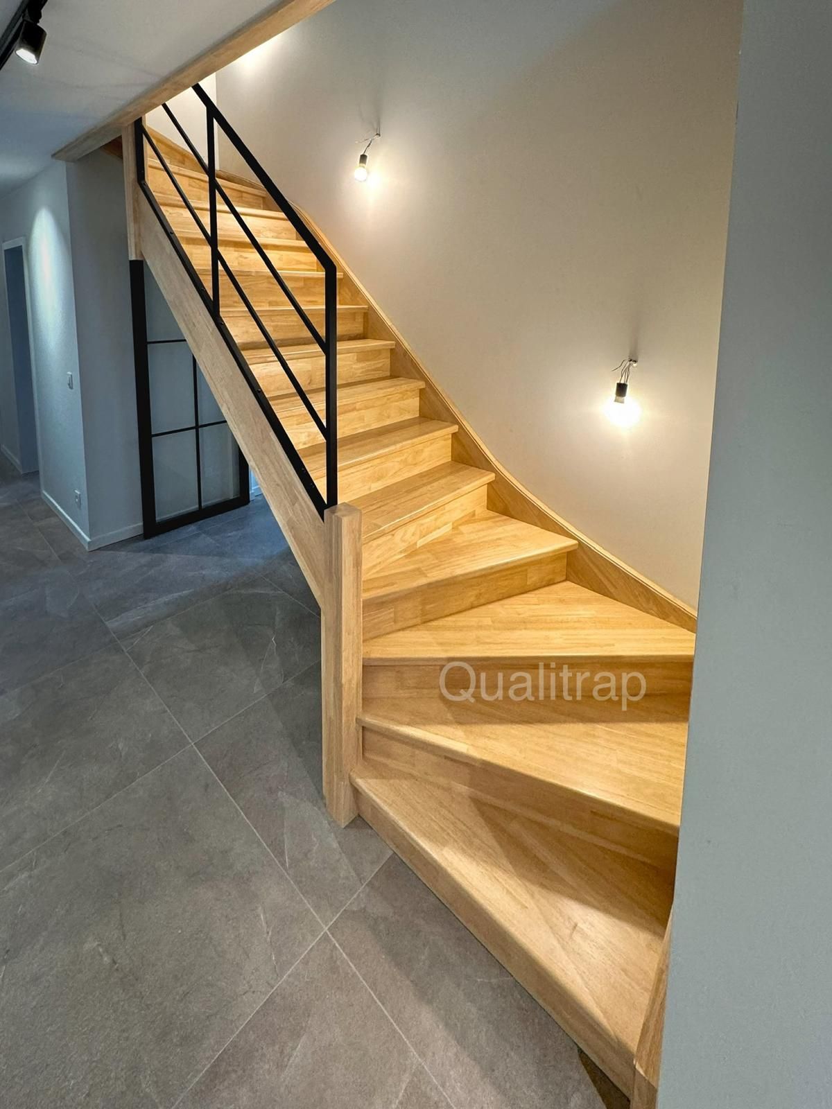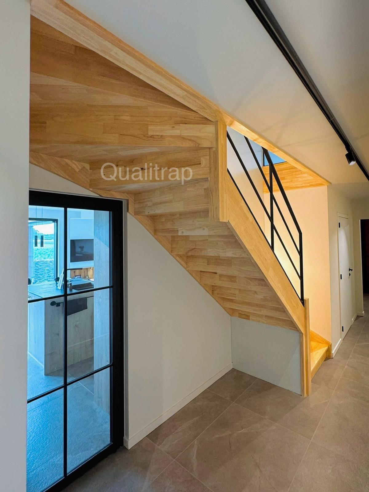 De trap naar keuze werd een moderne Rubberwood dubbele kwartdraai trap met een zwarte designleuning en balustrade. Deze combinatie vormt een mooi geheel met de zwarte accenten in het interieur en brengt warmte én karakter in de ruimte.